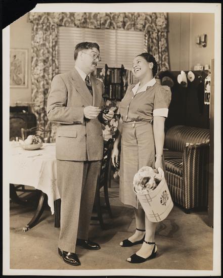 [Gee Gee James as Another Maid and Ethel Owen as Irma Dairymaple in "Three's a Family".]