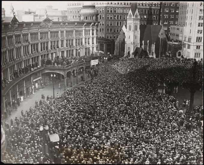 [Crowds at a campaign stop for Al Smith.]