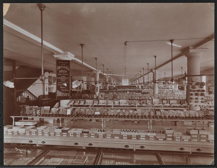 Interior of George Borgfeldt & Co. store, with rows of shelves full of goods, including brushes, mirrors, sponges, figurines and atomizers.
