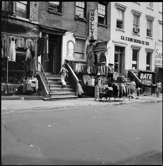 [Clothes for sale in front of 104-106 Rivington Street.]