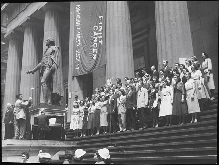 [Looking at 70 Pine Street from the steps of Federal Hall.]