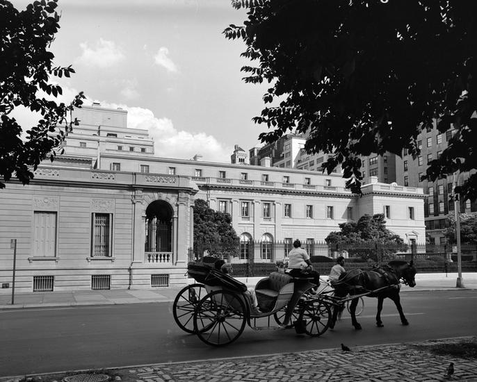 [Horse-drawn carriage on Fifth Avenue in front of The Frick Collection.]