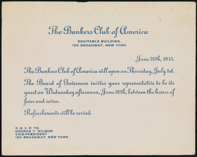Invitation to Edward Floyd De Lancey to attend a reception at the Lawyers' Club, April 29, 1889