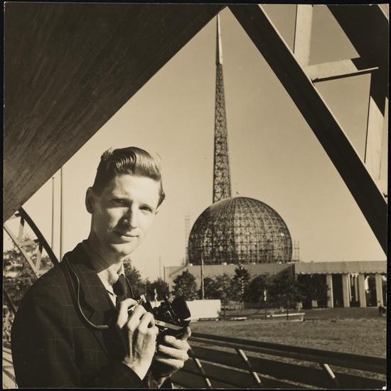 [Richard Wurts documenting the construction of the New York World's Fair site, with the frames of the Trylon and Perisphere in the background.]
