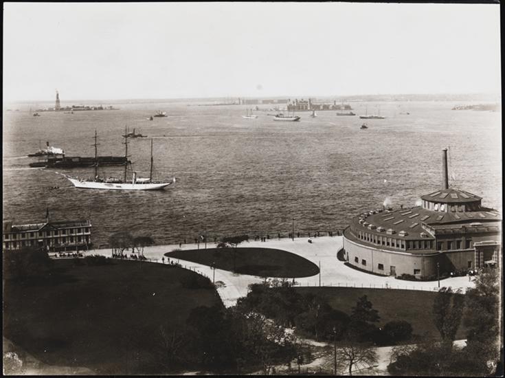 New York from The Battery. Showing Statue of Liberty and Ellis Island.