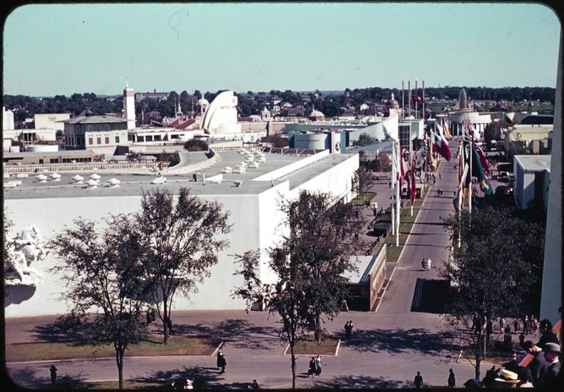[Avenue of the Pioneers looking towards the Trylon and Perisphere.]