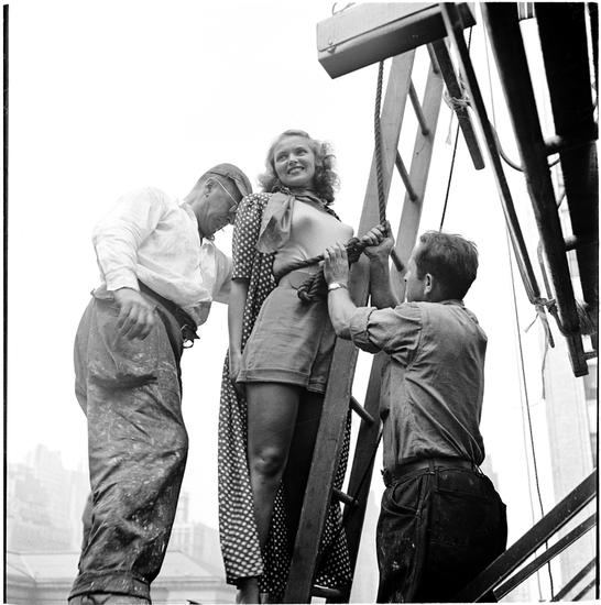 Advertising Outdoors [Painters helping model climb down scaffolding.]
