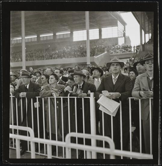 Aqueduct Race Track [Man crouched, reading a newspaper.]