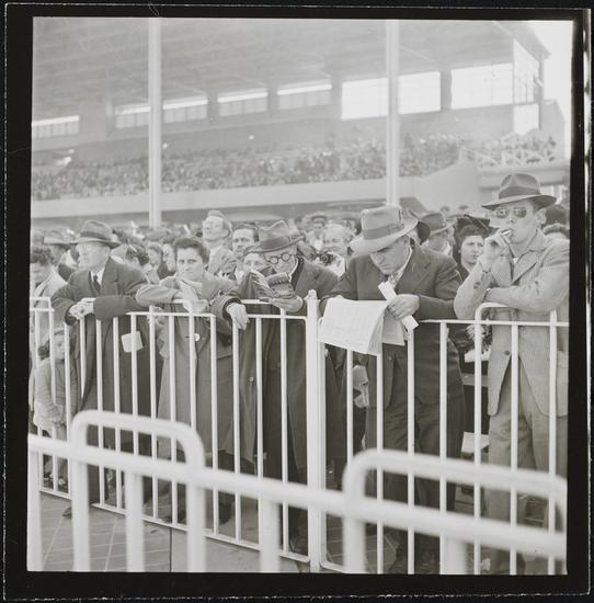 Aqueduct Race Track [Man crouched, reading a newspaper.]