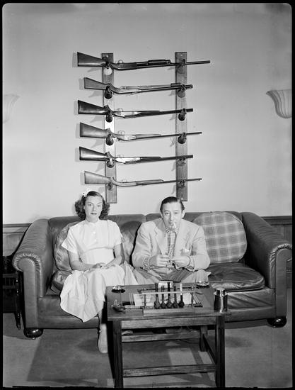 Billy Rose [Billy Rose and Eleanor Holm on a couch in front of a gun rack.]
