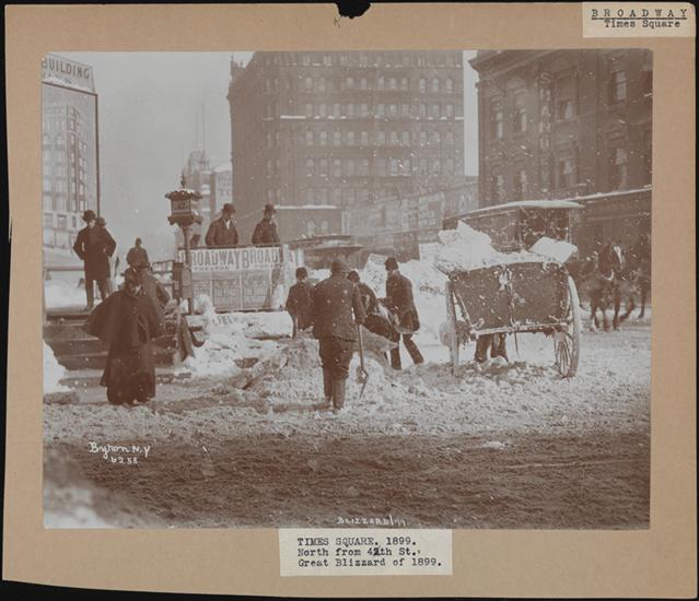 Men shoveling snow into a cart looking north at Broadway and 42nd Street.