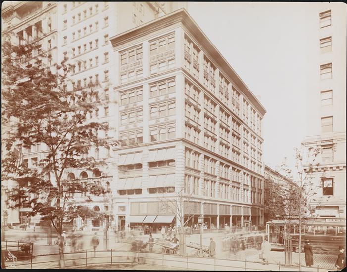 Taken from opposite corner of Roggers Peet Store with fruit vendors and street car visible.