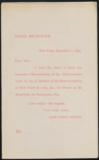 [Invitation to dinner at City Hall on November 25 in celebration of the evacuation of New York by the British.]