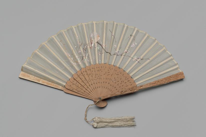 Folding fan of painted silk gauze mount with cherry blossoms, lilacs and bees