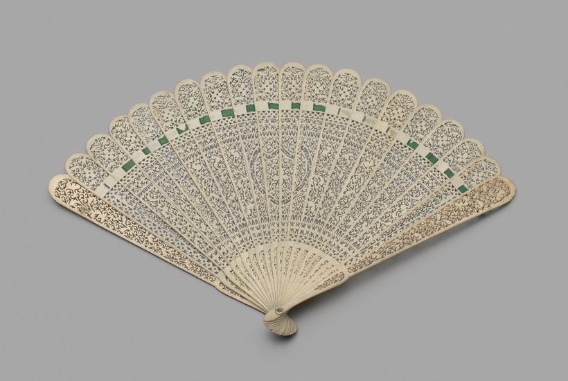 Brisé fan of pierced and carved ivory with original lacquer fan box