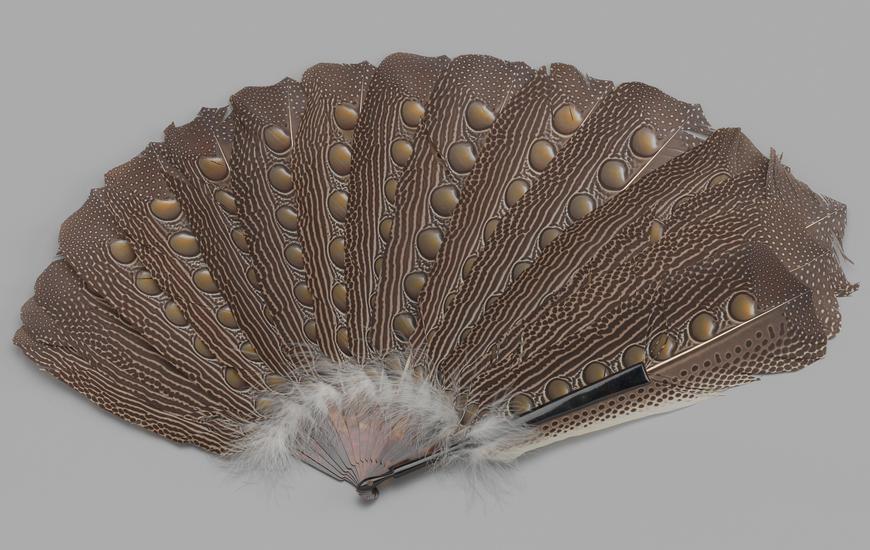 Folding feathered fan of yellow ostrich feathers tipped with birds' heads