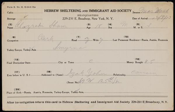 Immigration card issued to Sanel Alherowitch by the Hebrew Sheltering and Immigrant Aid Society