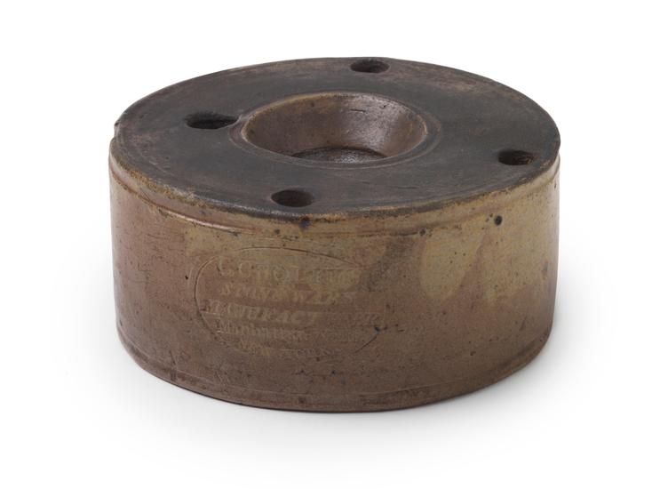 Round salt-glazed stoneware inkwell with tan ceramic body and light brown glaze, four holes on top for pens, and one large hole at top center for ink.