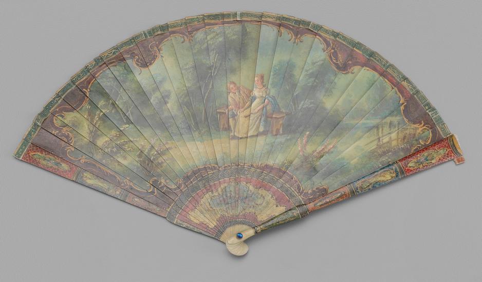 Brisé fan, lacquered ivory blades depicting painted figures in wooded setting