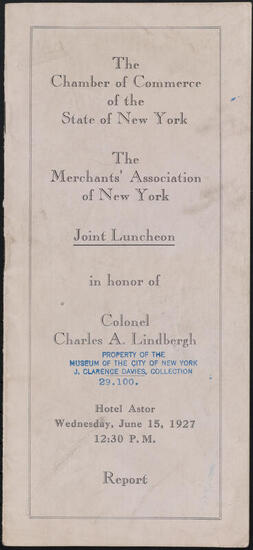 Breakfast in Honour of Captain Charles A. Lindbergh on the presentation of the Raymond Orteig 25,000 Dollar Prize