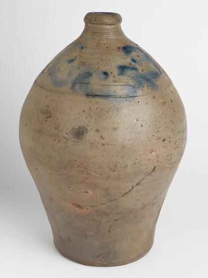 Salt-glazed stoneware jug with tan body, ring-tooling around neck and shoulder, cobalt oxide cloud pattern around maker's mark, and cobalt oxide around handle terminal.