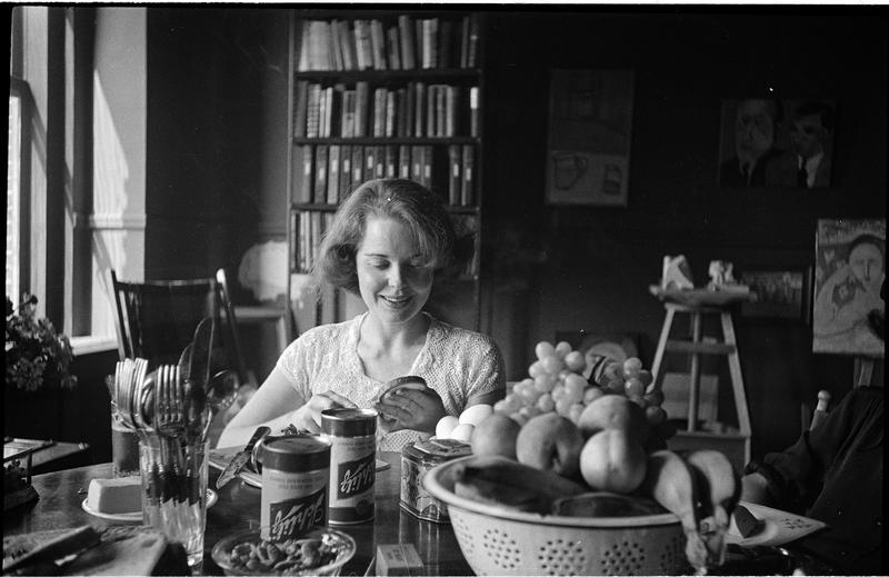Leonard Bernstein [Man bringing food to Leonard Bernstein at an outside table.]