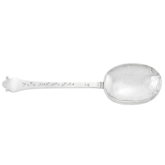 Memorial spoon with trifid upturned handle above broad lopsided oval bowl and shaped rattail on bowl back. Inscription: Abbreviated inscription in Dutch (in English): Domine Nicolaus van Rensselaer died November 12, 1678 / I [pellet] B Mark: Struck once on handle reverse, once on bowl reverse near tip of rat-tail: CV/B [in heart with barb extending from side of heart below C to upper serif of B]