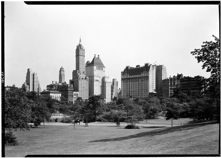 Sherry Netherland, Savoy Plaza Skyline from Central Park. From Hill at 85th Street. From Ritz to Plaza Skyline.