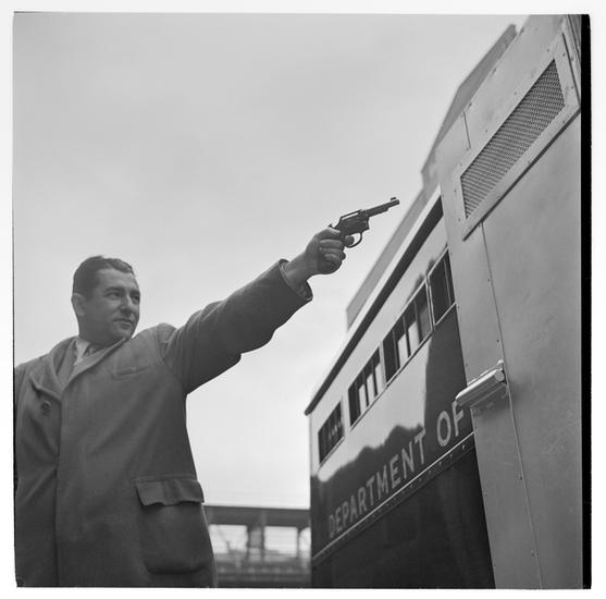 Paddy Wagon [Actor holding a gun on the set of the television show Paddy Wagon.]