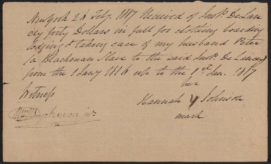 Receipt issued by Hannah Johnson to John Peter De Lancey for $40, for boarding and lodging Peter, January 1, 1818