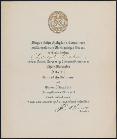 Reception to Their Majesties Albert I, King of the Belgians and Queen Elizabeth