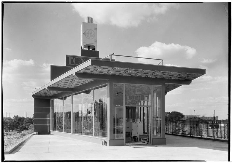 Rex Cole [showrooms]. Sharp view of entrance with cedars.