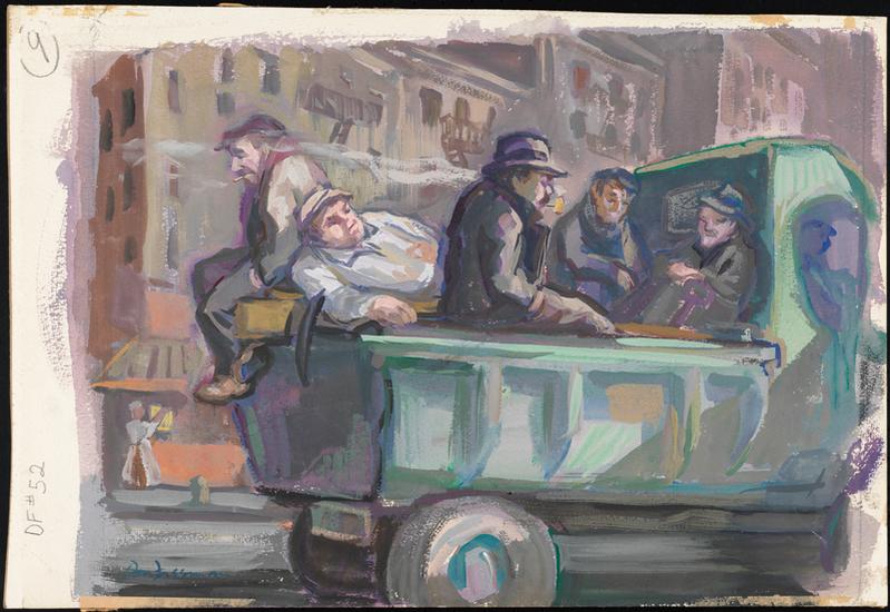 Don Freeman's Newsstand [Woman walking a dog as sanitation workers pick up garbage.]
