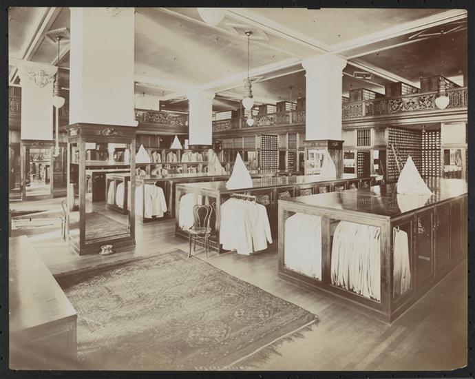 Showroom with cases of coats, spittoon and mezzanine.
