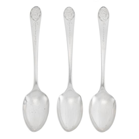 One of a set of three teaspoons with pointed egg-shaped bowl, pointed arch raised on back of the bowl, downturned straight handle with rounded ends, and bright-cut decoration. Inscription: Engraved on handle obverse: H. L. B. Mark: Struck on handle reverse: D. I. BURGER / [cock's head.]