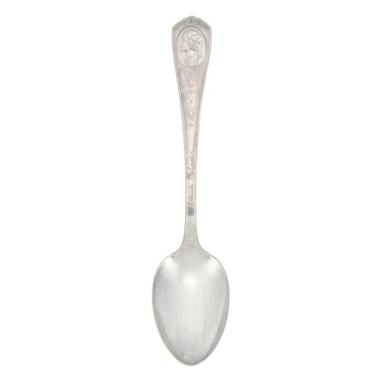 Teaspoon with tapered, upturned handle die-struck with scrolls and oval portrait medallion above egg-shaped bowl. Inscription: Die-struck on handle obverse: Norma Shearer. Mark: Marked on handle reverse: Oneida Community Par Plate.