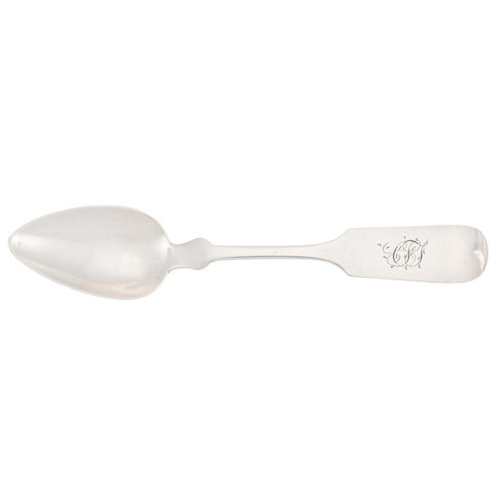 Teaspoon with upturned, front tipt, fiddle handle, rounded shoulders, and egg-shaped bowl. Inscription: Engraved on handle obverse in script: CIT. Mark: Struck on handle reverse in rectangle: W.T. & T.V. GENDAR.