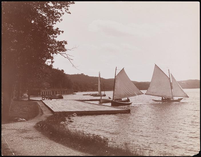 Sailboats, a dock and boathouses at Tuxedo Lake, Tuxedo Park, N.Y.