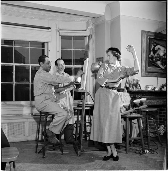 Art by Celebrities Sponsored by the Urban League [Woman posing as Duke Ellington paints.]