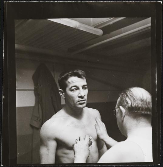 Rocky Graziano, He's a Good Boy Now [Man applying petroleum jelly to Rocky Graziano.]