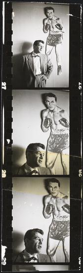 Rocky Graziano, He's a Good Boy Now [Rocky Graziano in front of cut-outs of boxers.]