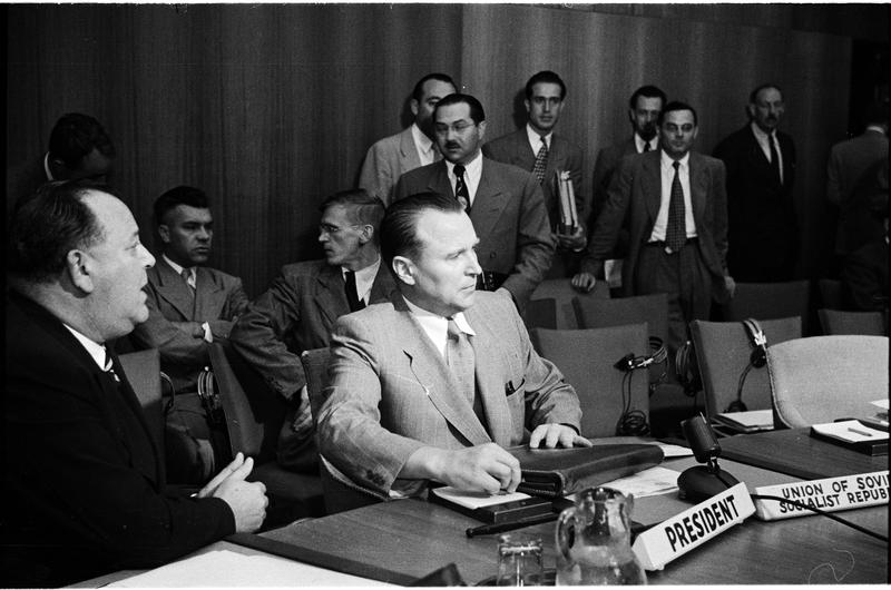 United Nations [Nasrollah Entezam speaking to the delegate from the USSR at General Assembly of the United Nations.]