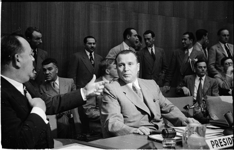 United Nations [Nasrollah Entezam speaking to the delegate from the USSR at General Assembly of the United Nations.]