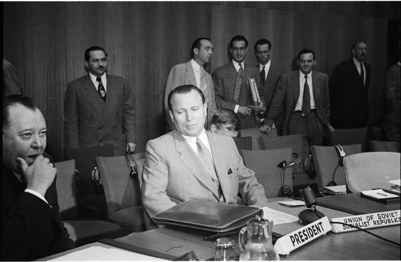 United Nations [Nasrollah Entezam speaking to the delegate from the USSR at General Assembly of the United Nations.]