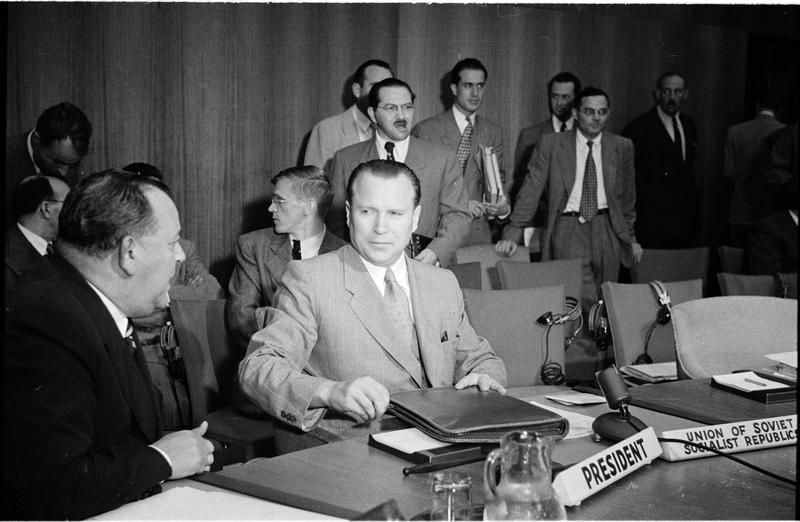 United Nations [Nasrollah Entezam speaking to the delegate from the USSR at General Assembly of the United Nations.]