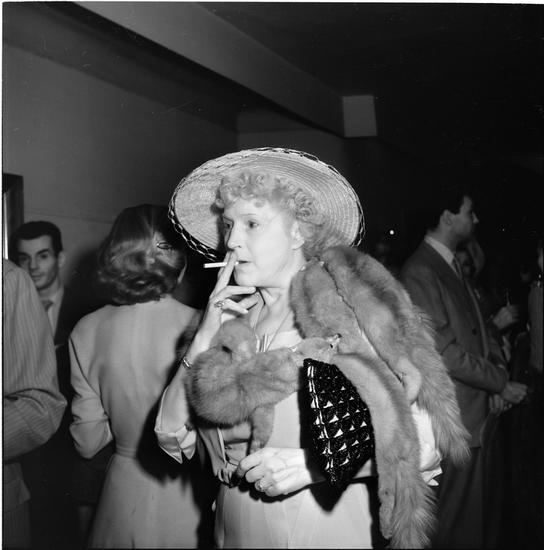 Celebrity Art Show [Woman smoking while talking with two men.]
