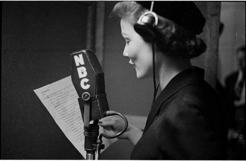 "Quick as a Flash" Radio Show - Aunt Jemima Sponsor [Gene Tierney with a script at a microphone.]