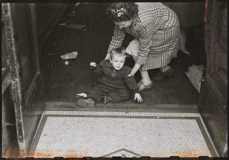 The 5 and 10 [Woman with a small boy from the doorway of a Woolworth's.]