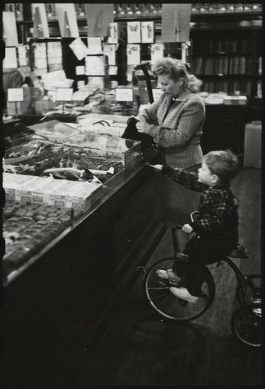 The 5 and 10 [Woman shopping with a boy riding a tricycle in Woolworth's.]