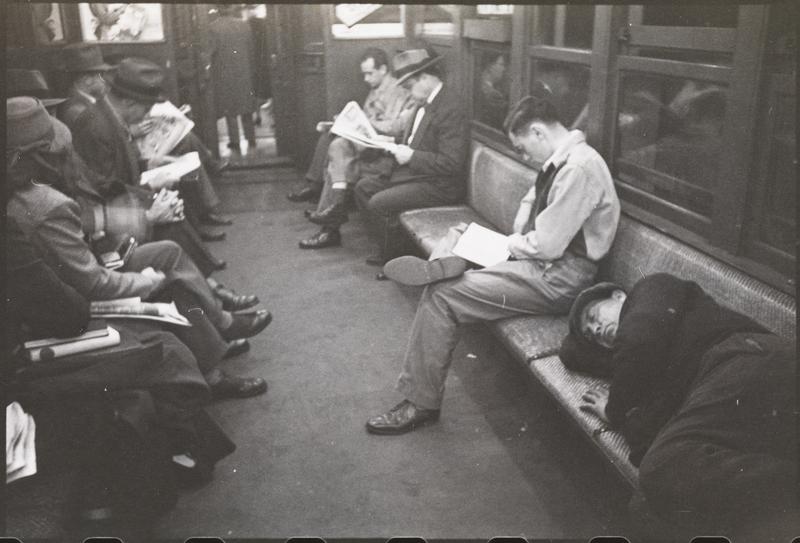 Life and Love on the New York City Subway [Passengers in a subway car, including a man sleeping.]